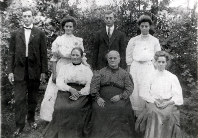 Circa 1908 Front row left to right: Aunt Ella-Sueler Pulliam (Mann), Nancy Ann Siegler (Pulliam), Georgia Hannah Pulliam (Ayers) Back row left to right: Garfield Pulliam, Bessie Ann (Snellings), Thomas Dewitt Pulliam, Lucy Mary Pulliam (Heaton)